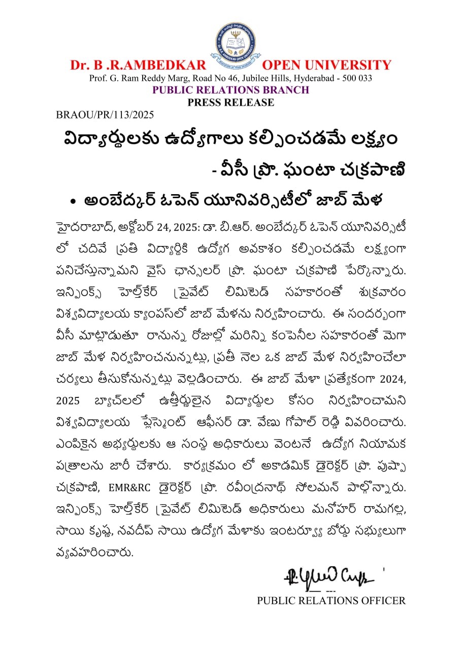 The main vision of the placement cell is to develop a rapid access to the learners of the university in the government sector and various multinational corporate companies so as to enable the students of Dr.B.R.Ambedkar Open University to get placements.  The main Endeavour of placement cell is to get students placed in multinational companies, NGO's Government and Private sector.