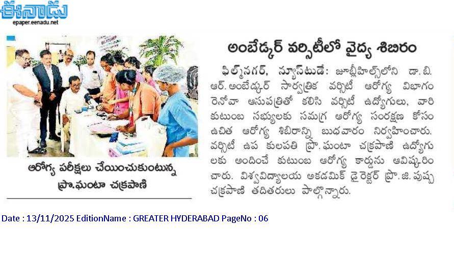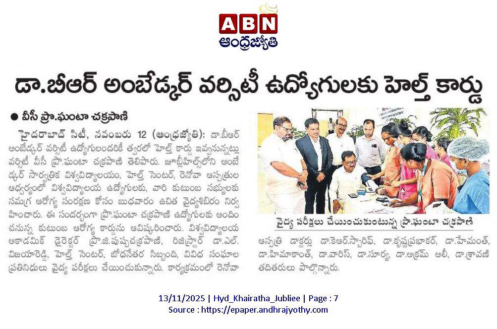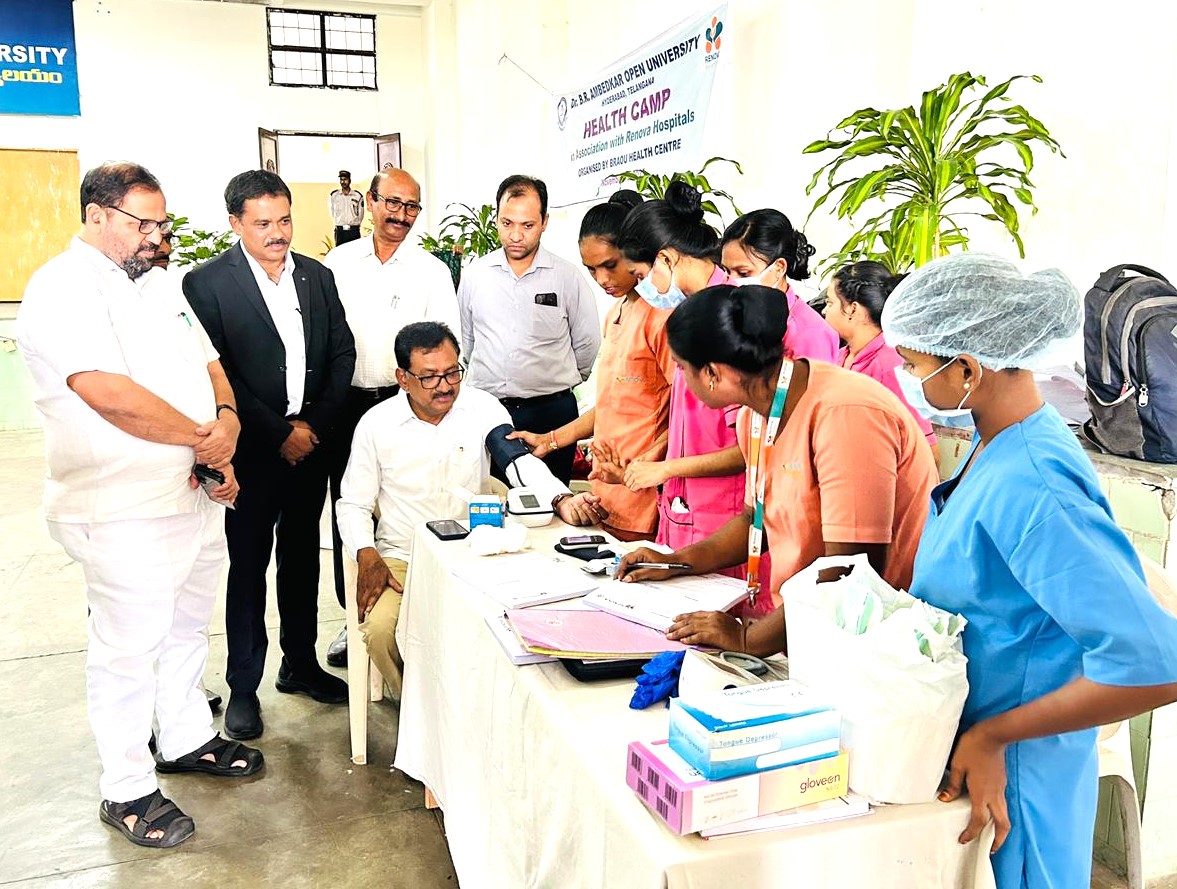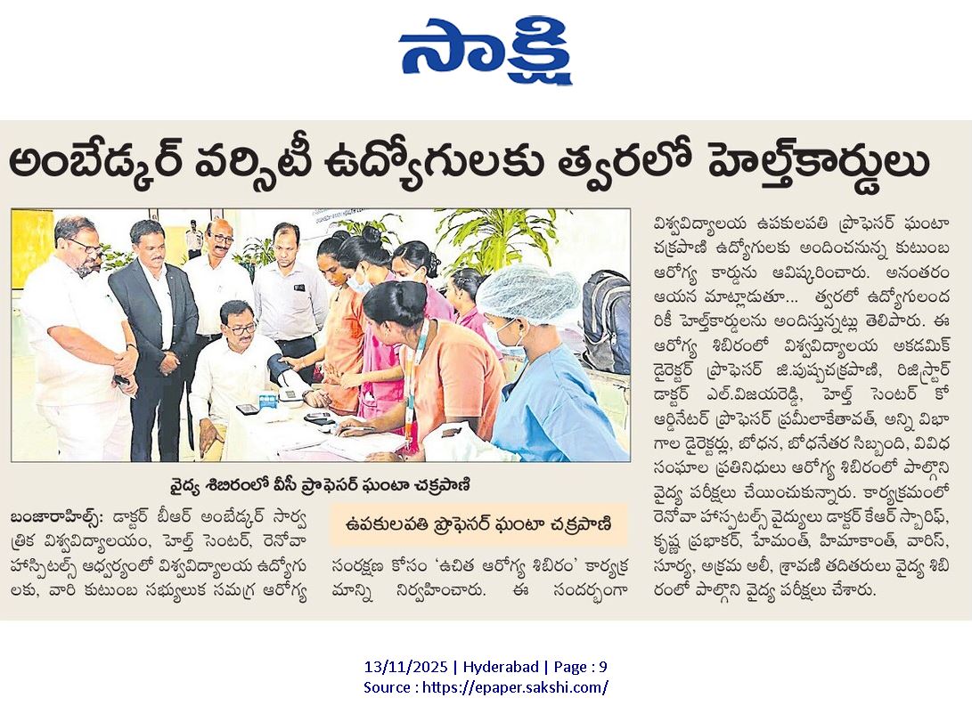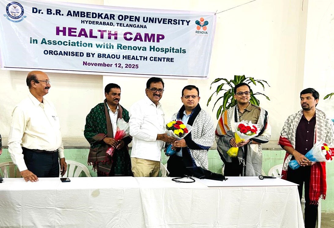 BRAOU ORGANISED HEALTH CAMP FOR STAFF Hyderabad, November 12, 2025: Dr. B. R. Ambedkar Open University, Health Centre conducted ‘Free Health Camp’ in collaboration with Renova Hospitals for the University employees at its Campus at Jubilee Hills on Wednesday. Prof. Ghanta Chakrapani, Vice-Chancellor unveiled the Family Health Card. He said that health cards will be provided to the employees soon. Prof.G.Pushpa Chakrapani; Dr. L. Vijaya Reddy, Registrar; Director Academic; Prof.Prameela Kethavath, heath camp, coordinator all Directors, Deans, Heads of the Branches and Teaching and Non-Teaching Employees of the University attended the health camp. The Doctors from Renova Hospitals Dr. KR.Sbariff- Vice President Medical Services; Dr Krishna Prabhakar- Director Deparment of General Medicine; Dr. Hemanth-Director Dental Medicine; Dr. Himakanth- Orthopedic Department; Dr. Waris - Unit Head (Administration); Dr Surya, Dental; DrAkram Ali and Dr Sravani were the directors for the health camp.