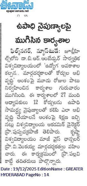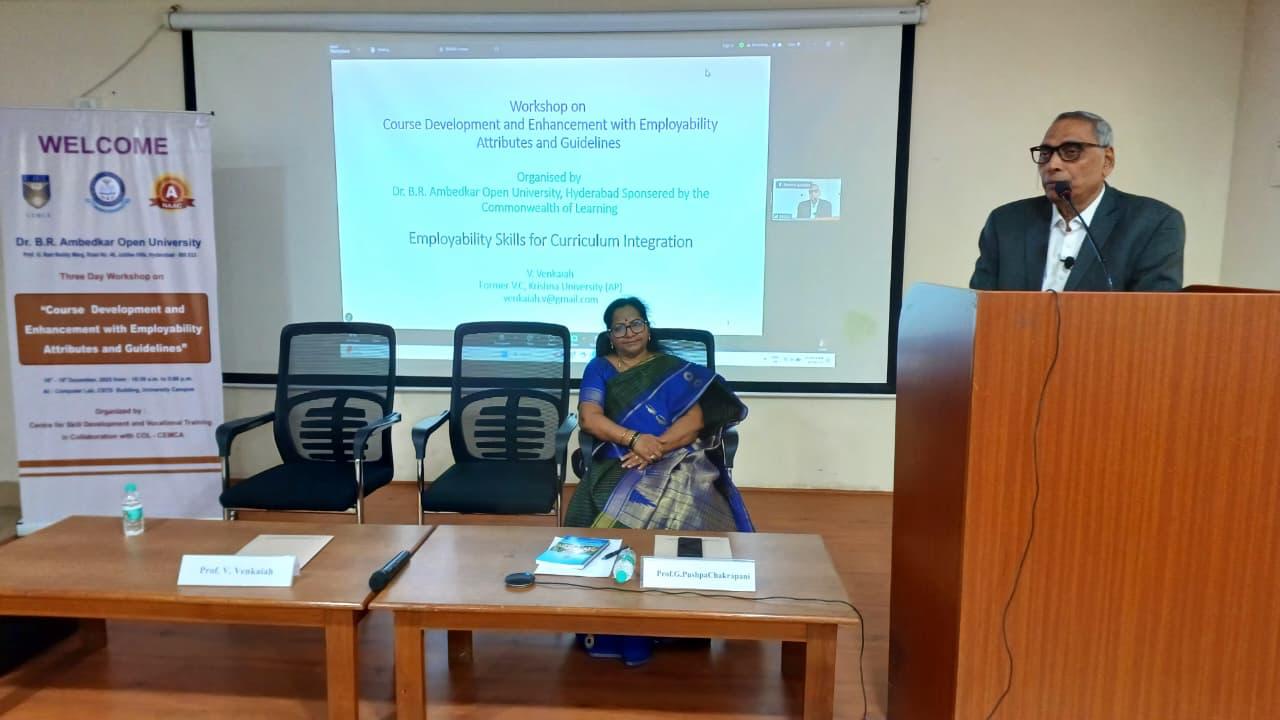BRAOU ORGANISED THREE DAY WORKSHOP ON “COURSE DEVELOPMENT” Hyderabad, December 16, 2025: Dr.B.R.Ambedkar Open University, Centre for Skill Development and Vocational Training centre organised three day workshop on “Course Development and Enhancement with Employability Attributes and Guidelines" in Collaboration with Commonwealth of Learning & Commonwealth Educational Media Centre for Asia (COL-CEMCA) on December 16-18, 2025 at Computer Lab, CSTD Building, University Campus on Tuesday. The chief Guest Prof. Prof. Pushpa Chakrapani, Director Academic said this workshop is a part of the Employability Framework developed by BRAOU under the Graduate Employability Project, which is first of its kind in the country. This Employability Framework has received appreciation from the Director of CEMCA, Dr.B.Shadrach as BRAOU is the first among 18 Open Universities to develop Employability Framework and going forward towards its implementation. This workshop is being organized under the mentorship of Prof. V.Venkaiah, former Vice Chancellor of Krishna University who was designated by COL as the consultant to hand-hold BRAOU. Prof. Pallavi Kabde, Coordinator, Skill Development and Vocational Training Centre is the Co-ordinator said the workshop will integrate Employability Skills into the curriculum offered by different disciplines of the University. The development of courses with employability integration is the final outcome of this workshop. Prof. Rabindranath Solomon, Director, EMR&RC, Heads of Academic Departments and faculty members participated in the workshop.