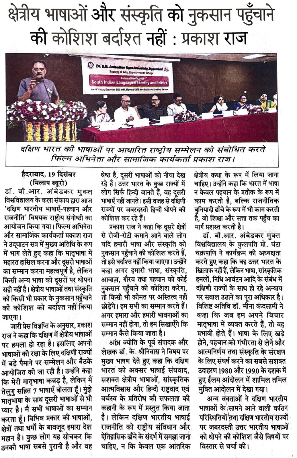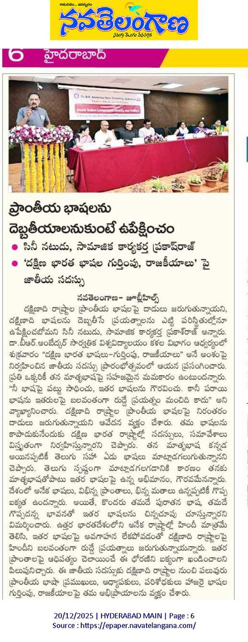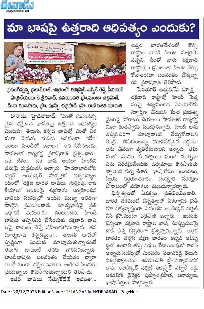 BRAOU organised National Seminar on “South Indian Languages: Identity and Politics” Hyderabad, December 19, 2025: Dr. B. R. Ambedkar Open University, faculty of Arts organised National Seminar on “South Indian Languages: Identity and Politics” on Friday at its campus. Shri Prakash Raj, Cine Actor and Social activist attended as the Chief Guest for the Inaugural session. Prakash Raj said that everyone has affection for their mother tongue, and while it's important to master your own language and respect other languages, it's not right to try to impose a foreign language on others. He stated that regional languages in the South are under attack, and therefore, conferences and meetings are being held extensively in the southern states to protect their languages. He said, "My mother tongue is Kannada, but I speak 7 languages, including Telugu. That's why I speak Telugu so clearly. I have affection for other languages along with my mother tongue. I respect those languages. Despite having so many languages, diverse regions, and different religions, our country is very great. However, some people, thinking that their language is the oldest and that they are superior, are looking down upon other languages. In some states of North India, people only know Hindi; they don't know other languages. Because of this, they are trying to forcibly impose Hindi on the southern states." Prakash Raj warned that if people come from other regions to earn a living and try to harm our language and culture, it will not be tolerated. He explained, "Our language, our culture, our voice, our pride, our identity – we will not give up our existence under any circumstances if someone tries to harm it. We respect you, and if you don't respect us, we will teach you how to respect us."