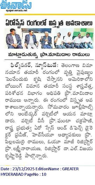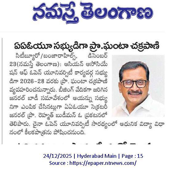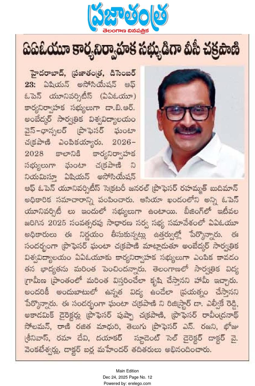 BRAOU Organised Narla Memorial Lecture Hyderabad, December 1, 2025: Prof.C.Mrunalini, Head department of Telugu, Arya University, Silicandhra(America) Retired professor, Potti Sreeramulu Telugu University, Hyderabad delivered the 30th Narla Memorial Endowment lecture on “Narla Sahitya Rachanalu- Vishleshaana” at Dr.B.R.Ambedkar Open University Hyderabad on monday. Prof.Mrunalini said Narla is a prominent Telugu writer, journalist, and playwright known for his realistic one-act plays, societal critique, and significant contributions to Telugu journalism. His works focused on human values, rationalism, and critiquing social injustices. He was particularly known for his one-act plays that brought a sense of realism to the Telugu stage like Sita Josyam, Narakam lo Harischandra, Jabali, Paatha Kotha. Prof.Ghanta Chakrapani Garu, Vice-Chancellor, BRAOU, Vice-Chancellor, BRAOU who presided over the function, said that the society needs journalists like Narla in the current situation whose values stood as ideal for journalists. Narla's family members donated valuable books to University Library. Dr.L.Vijaya Krishna Reddy, Registrar of the University also spoke on the occasion. Prof.N.Rajani, incharge Library explain about needs of the program and introduced the chief guest. Earlier the Chief Guest, Directors, Deans, Heads of Branches, Teaching and Non-Teaching Staff Members, representatives of service associations offered floral tributes the Portrait of Narla.
